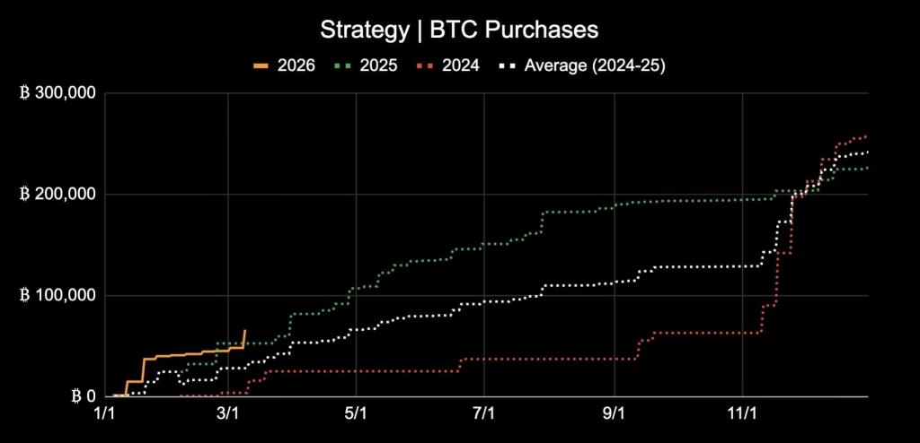 The company, formerly known as MicroStrategy, held 738,731 BTC as of March 8, up from 672,500 at the end of 2025. This represents an addition of 66,231 coins in 68 days, already surpassing its full-year net purchases in 2021, 2022, or 2023.